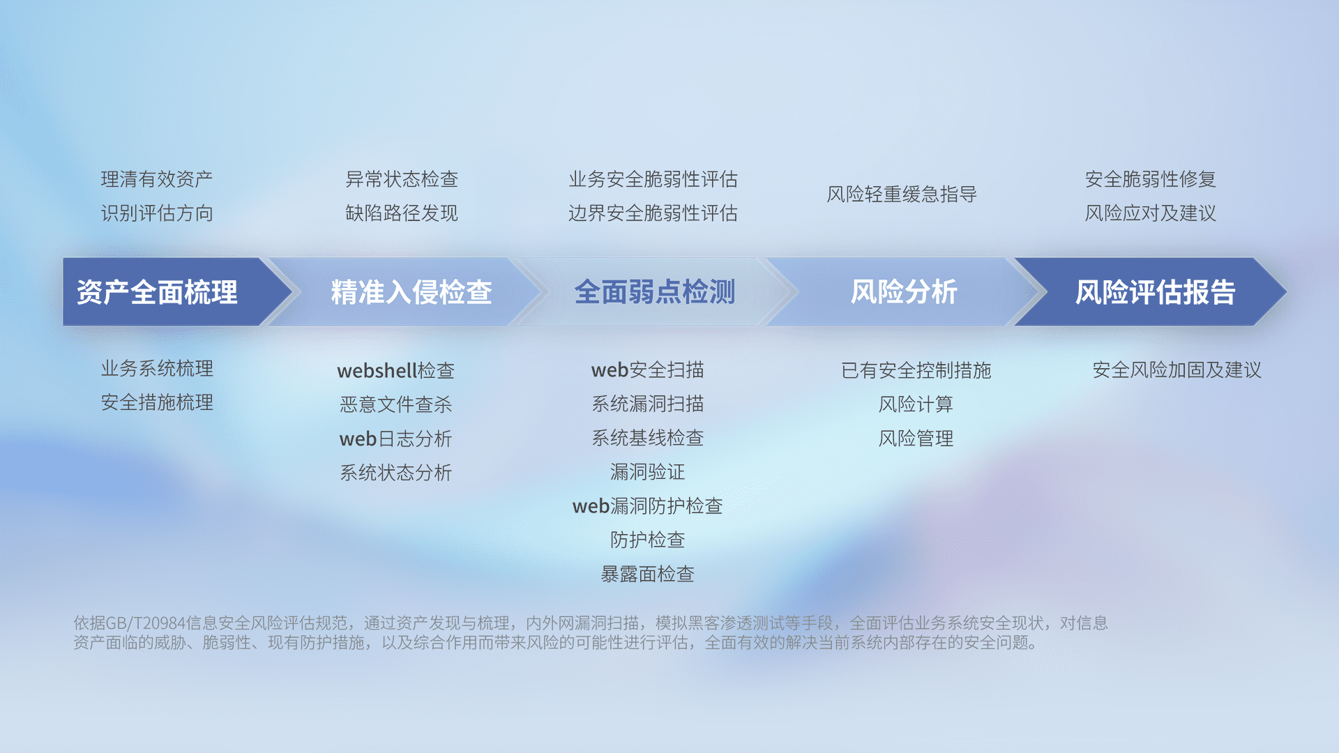 针对客户行业特性,,,,以专业的安全服务+多厂商联合解决方案提供专属的一站式安全管理服务,,,帮助客户全面感知网络空间威胁,,基于识别、、检测、、分析、、、防护、、、、监测、、、、响应的服务理论模型,,从方案咨询、、、、集成交付、、、、评估验证、、优化加固、、、运维运营,,,,致力于为客户提供完整的闭环管理式安全服务。。。。以实战经验为客户打造高抵御风险的安全体系,,帮助客户发现威胁、、、对抗威胁、、处置威胁,,不断积累安全对抗能力,,,,持续保障数字化安全。。